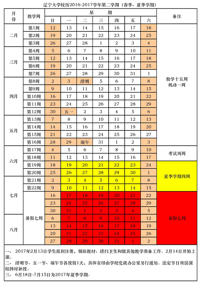 2016-2017学年第二学期(春季、夏季学期)校历