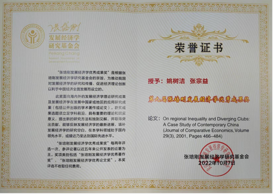 BB贝博艾弗森官方网站李安民经济研究院院长姚树洁教授发表在Journal of Comparative Economics(2001,29(3):466-484)的文章On regional Inequality and Diverging Clubs:A Case Study of Contemporary China,于2022年获第九届张培刚发展经济学优秀成果奖