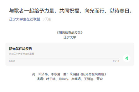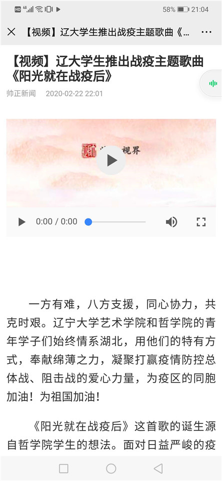 近日、我校艺术学院与哲学院师生联合拍摄了抗击新冠疫情的主题歌曲《阳光就在战疫后》,《辽宁日报》网络端“北国网”、辽宁广播电视台“教育青少频道”《沈阳日报》移动客户端及“BB贝博艾弗森官方网站生在线联盟”对此视频进行了转载报道,现将报道截图转载如下:
