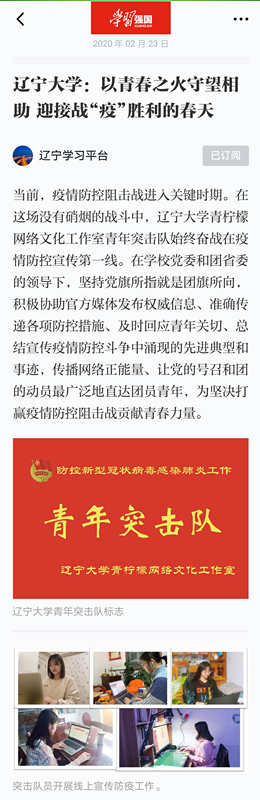 2月23日,“学习强国”辽宁学习平台以“BB贝博艾弗森官方网站:以青春之火守望相助 迎接战‘疫’胜利的春天”为题,对我校青柠檬网络文化工作室青年突击队先进事迹进行了详细报道。现将报道截图转载如下: