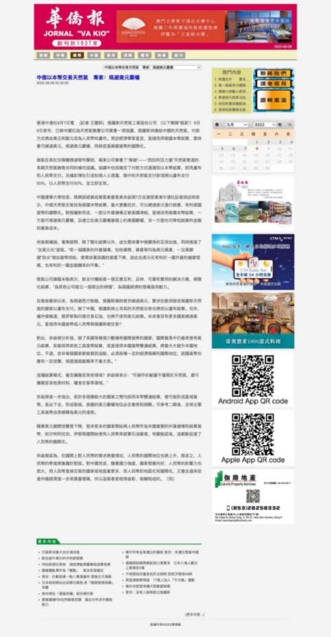 香港新闻网9月7日电 俄罗斯天然气工业股份公司(以下简称“俄气”)9月6日宣布,已与中国石油天然气集团公司签署一项协议,俄罗斯供应给中国的天然气,付款方式将由美元和欧元改为人民币和卢布。受访经济学家直言,直接改用两国本币结算,意味着可绕过美元,规避美元霸权,同时促进两国货币的国际化。