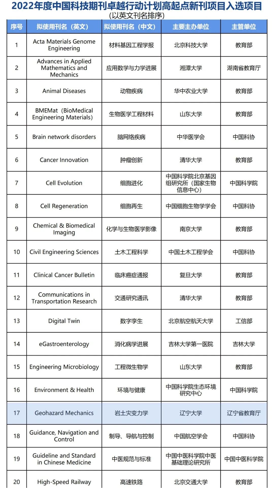 9月21日,中国科技期刊卓越行动计划办公室发布了《关于下达2022年度中国科技期刊卓越行动计划高起点新刊入选项目的通知》,BB贝博艾弗森官方网站与中国岩石力学与工程学会组织申报的Geohazard Mechanics(ISSN:2949-7418)入选高起点新刊项目。入选后,期刊将获批国内统一连续出版物号,在中国落地,同时获批资助经费50万元。