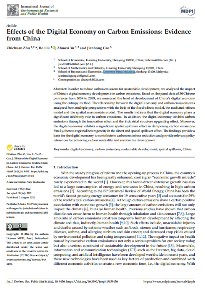 数学与统计学院祝志川教授在International Journal of Environmental Research and Public Health 2022年第19卷发表学术论文Effects of the Digital Economy on Carbon Emissions: Evidence from China。经济学院硕士生刘博、数学与统计学院于卓熙教授和马来西亚博特拉大学Jianhong Cao教授参与论文写作。