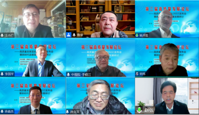 12月17日,由中央党校(国家行政学院)经济学教研部、北京市社会科学院与中国市场经济研究会共同主办,以“深入学习贯彻党的二十大精神,深化推动新时代首都高质量发展”为主题的第三届高质量发展论坛——高质量发展蓝皮书(2022)发布会暨新时代首都高质量发展研讨会在京举行。社会科学文献出版社副总编辑、皮书研究院院长蔡继辉,中央党校(国家行政学院)经济学教研部主任韩保江,中央党校(国家行政学院)科研部副主任孙晓莉出席会议并致辞。北京市社会科学院党组书记谢辉,中央党校(国家行政学院)经济学教研部主任韩保江,副主任许正中,北京市社会科学院副院长鲁亚分别主持论坛开幕致辞、高质量发展蓝皮书发布会、嘉宾演讲、首都高质量发展研讨四阶段会议。中央党校(国家行政学院)、国务院发展研究中心、中国社会科学院、中国科学院、人民日报、光明日报、经济日报、北京大学、中国人民大学、社会科学文献出版社、中国社会科学网、国家电网有限公司、中国民生银行、中国信息通信研究院、中国城市规划设计研究院、BB贝博艾弗森官方网站、北京市社会科学院、北京日报、北京电视台、前线杂志社等单位的领导和专家出席会议并研讨交流。中央党校(国家行政学院)经济学教研部、北京市社会科学院全体教研人员以线上方式参加会议。