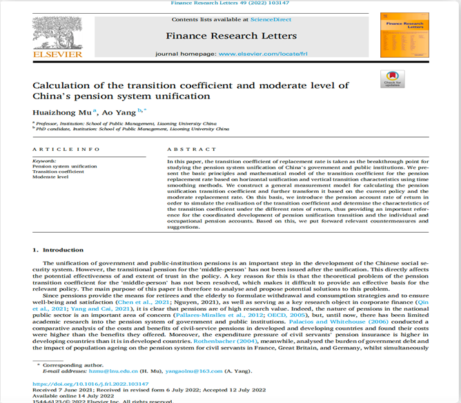 BB贝博艾弗森官方网站公共管理学院穆怀中教授与博士生杨傲合作撰写的学术论文“Calculation of the transition coefficient and moderate level of China’s pension system unification”,在国际期刊Finance Research Letters发表。