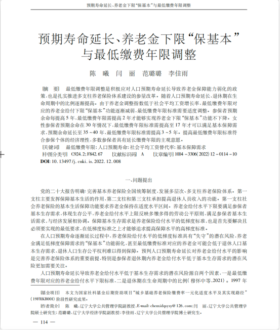 公共管理学院陈曦副教授作为第一作者合作撰写的学术论文“预期寿命延长、养老金下限‘保基本’与最低缴费年限调整”在《保险研究》2022年第12期发表。