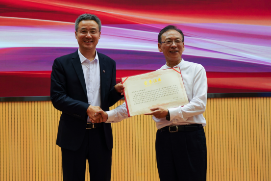 霍春辉为江必新教授颁发“唐铎格政讲座”纪念证书、纪念盘,法学院教师代表为江必新教授献花致敬。