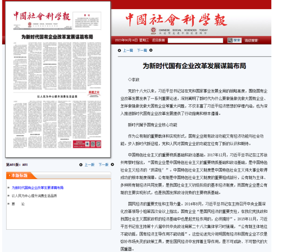 经济学院李政教授在2023年6月14日的《中国社会科学报》头版发表题为《为新时代国有企业改革发展谋篇布局》的署名文章,全文如下: