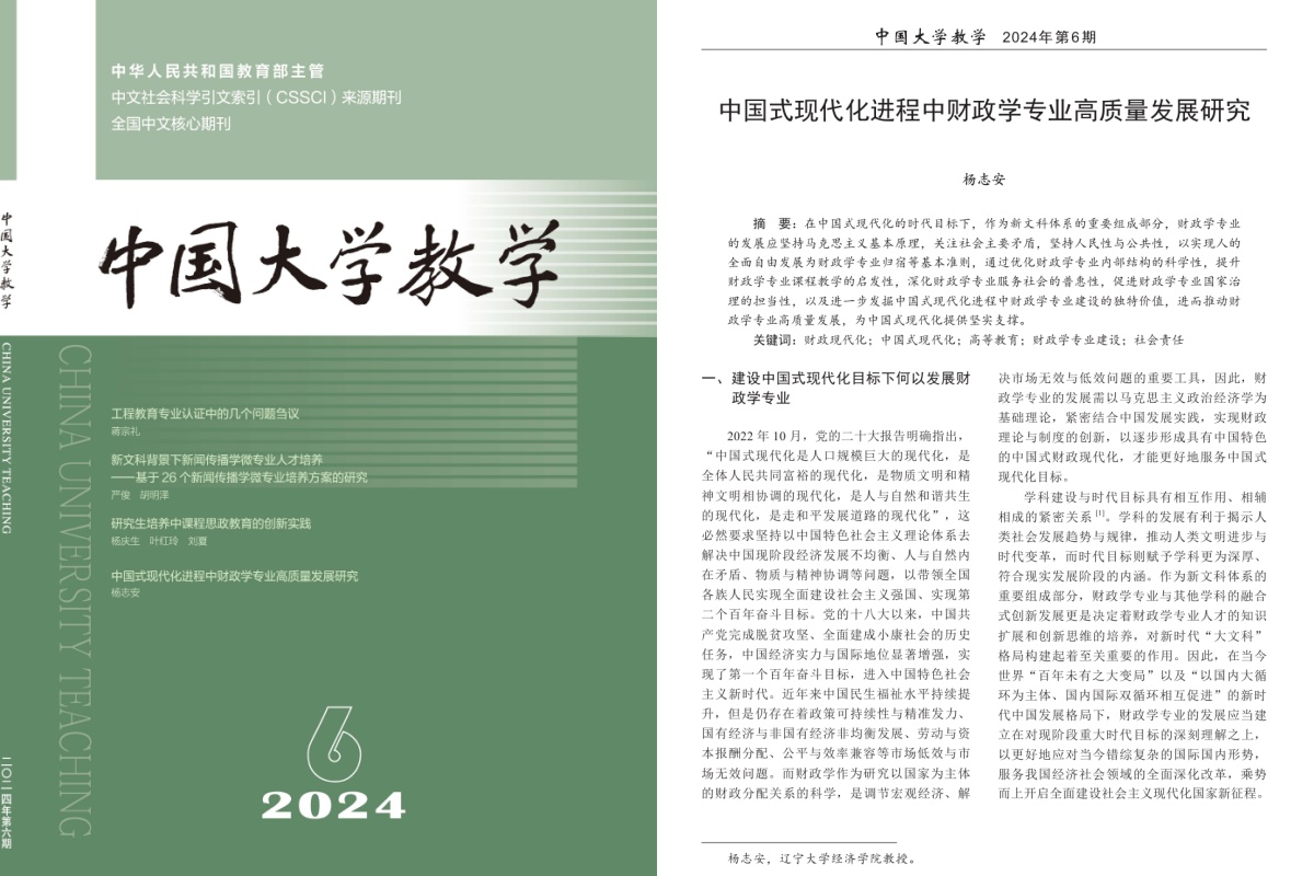 BB贝博艾弗森官方网站经济学院杨志安教授在《中国大学教学》2024年第6期发表论文《中国式现代化进程中财政学专业高质量发展研究》。