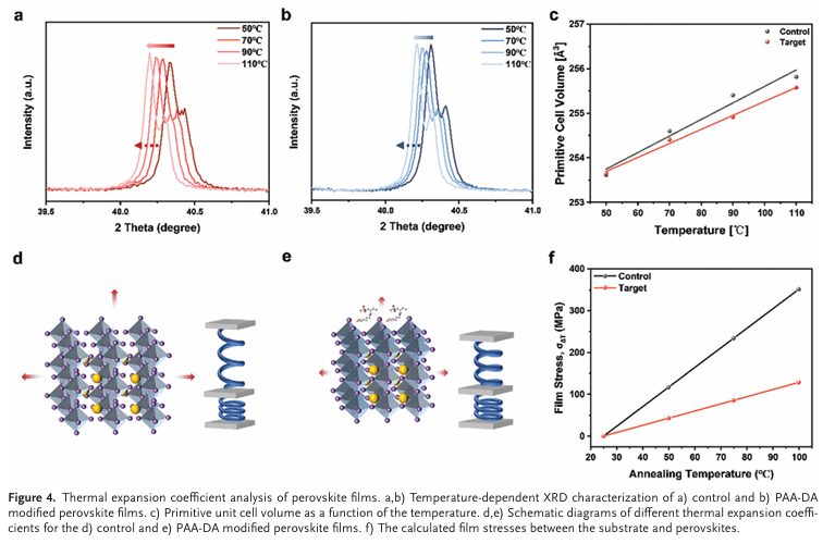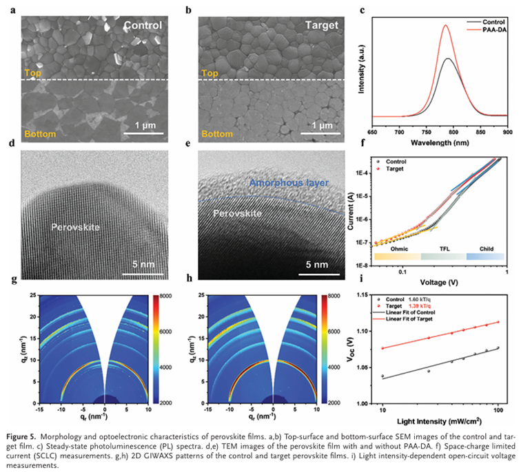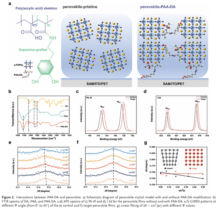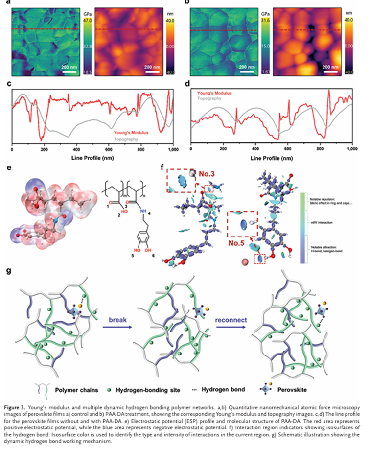 柔性钙钛矿太阳能电池在其使用寿命期间经常经历持续或周期性弯曲。多晶钙钛矿薄膜的破裂以及钙钛矿和基底界面的分层可能导致器件发生灾难性故障,从而带来严重的稳定性问题。丁勇教授团队与合作者开发了一种多重动态氢键聚合物网络,以两种方式增强柔性钙钛矿太阳能电池的机械强度。聚丙烯酸主链通过其柔性和空间占据将钙钛矿和基底之间的热膨胀系数失配降低了16.7%。多巴胺支链提供多个动态氢键位点,这有助于增加应力变形时的能量耗散,并将钙钛矿的杨氏模量降低54.3%。反式柔性钙钛矿太阳能电池在连续1个太阳等效光照下2000小时内实现了23.02%的最佳功率转换效率,并保持了初始效率的81.3%。此外,器件表现出优异的机械稳定性,经过5000次弯曲循环后仍能保持原始值的90.2%。