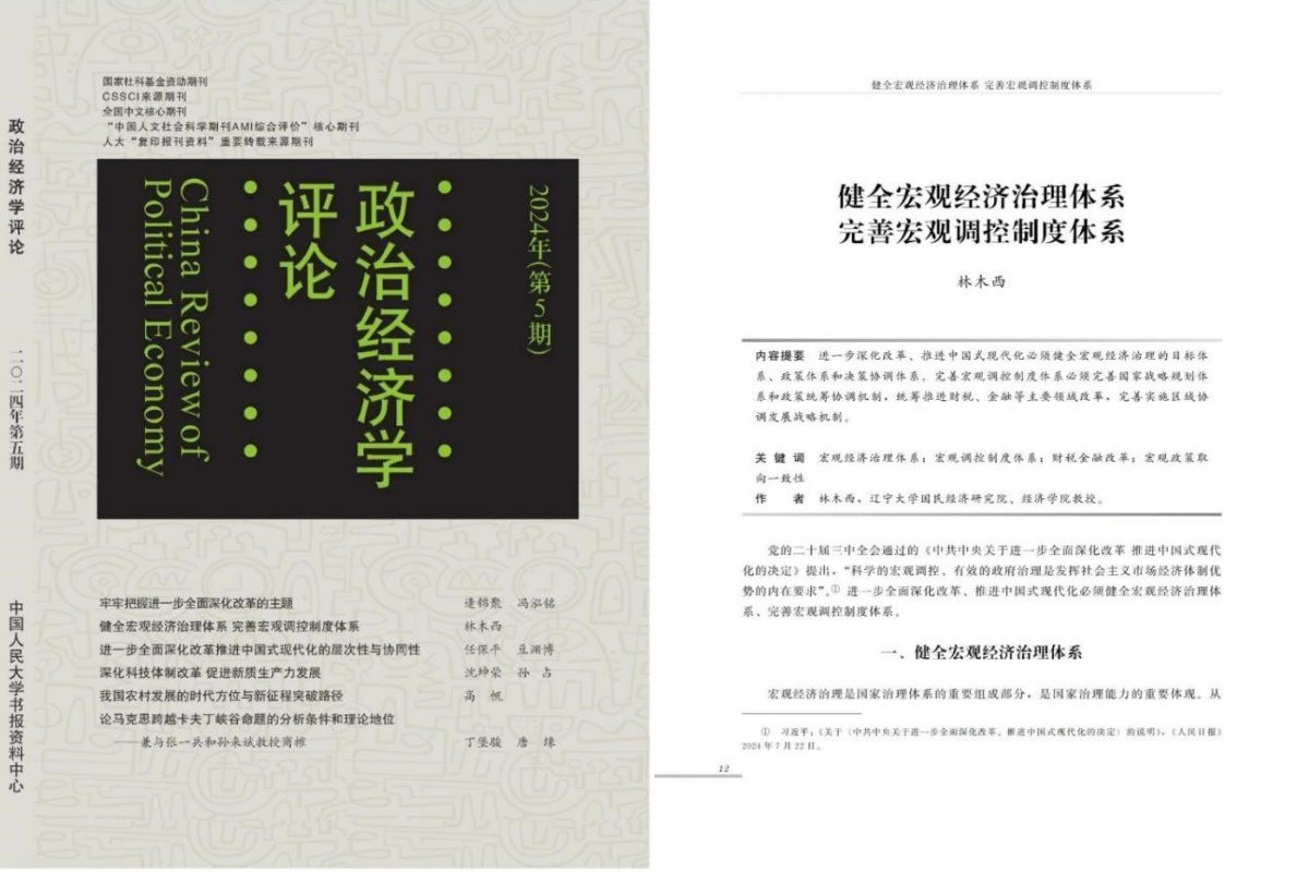 近日,国民经济研究院院长林木西教授的论文《健全宏观经济治理体系 完善宏观调控制度体系》在《政治经济学评论》2024年第5期发表。
