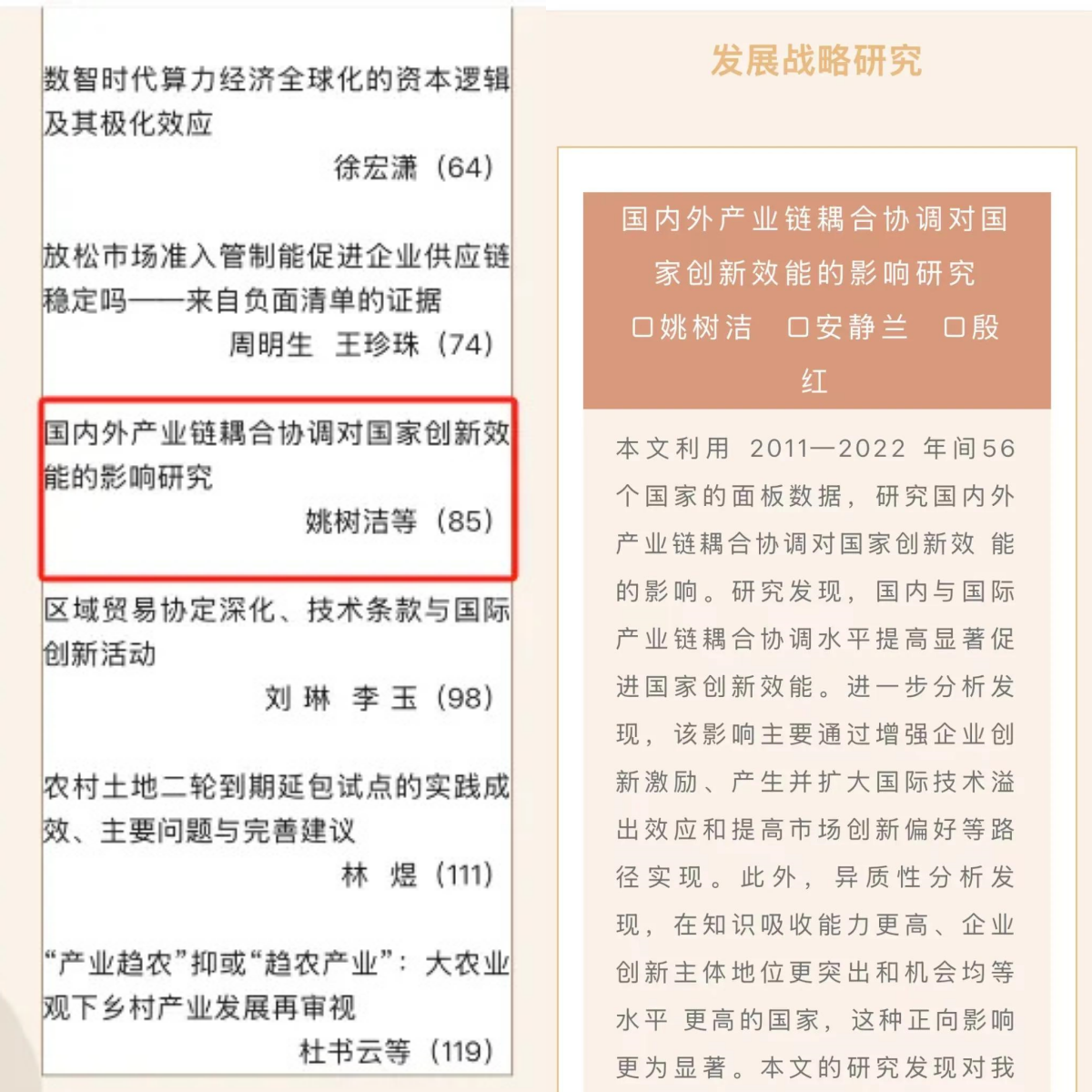 李安民经济研究院院长姚树洁教授与国际经济政治学院殷红教授、博士生安静兰的合作论文“国内外产业链耦合协调对国家创新效能的影响研究”,被CSSCI期刊《经济学家》接受发表,该期刊系校级B类期刊。
