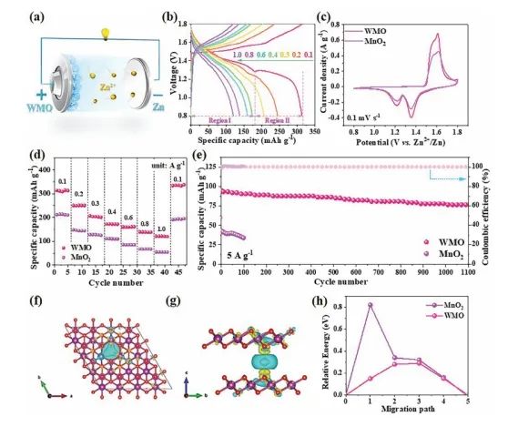图 4 展示了锌离子电池中WMO作为正极材料的电化学性能测试结果,包括了充放电曲线、循环伏安曲线、不同电流密度下的倍率性能和循环稳定性测试,以及通过密度泛函理论(DFT)计算得到的电子性质和锌离子在WMO中的迁移特性。
