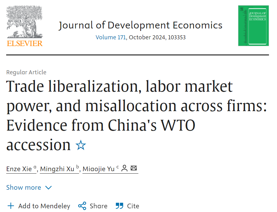 据JDE官网显示,来自浙江大学的解恩泽、北京大学的徐铭梽、BB贝博艾弗森官方网站的余淼杰,合作撰写的论文“Trade liberalization, labor market power, and misallocation across firms: Evidence from China's WTO accession”,在发展经济学顶级期刊《Journal of Development Economics》线上正式发表。