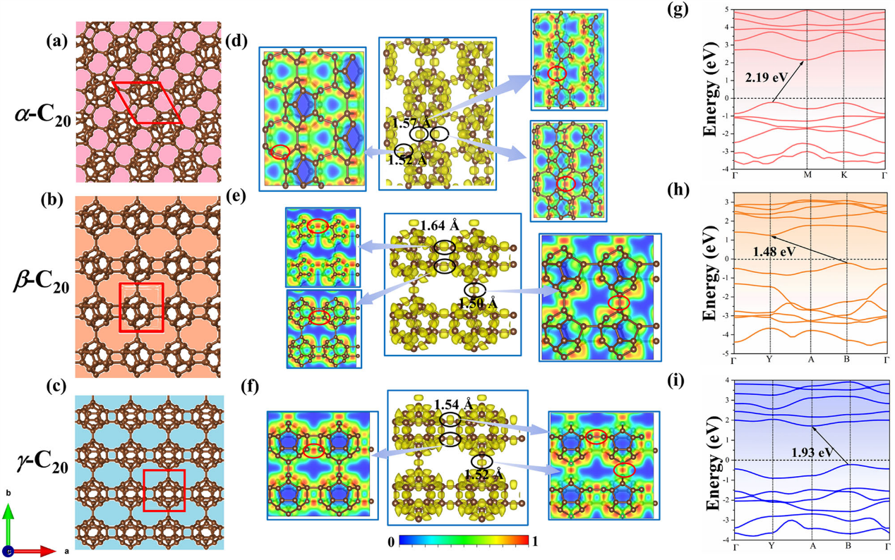 该研究通过第一性原理计算构建了三种二维C20基单层材料(α-C20、β-C20、γ-C20),系统分析其几何稳定性(动态/热力学/机械稳定性)、电子性质(间接带隙2.19-1.48 eV)及载流子迁移率(最高达9.61×104 cm2V-1s-1)。其中α-C20单层展现11.86%的太阳能转氢效率,其析氢反应的吉布斯自由能仅0.0147 eV,具备优异催化活性。
