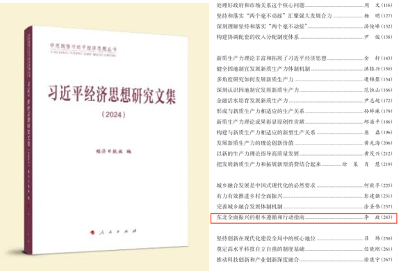 为不断深化习近平经济思想的体系化学理化研究,2024年,经济日报社联合中央党校(国家行政学院)习近平新时代中国特色社会主义思想研究中心等16家机构面向海内外进行征文,编发大量优秀理论文章,集结成《习近平经济思想研究文集(2024)》,其中收录并刊发了BB贝博艾弗森官方网站经济学院李政教授的理论文章《东北全面振兴的根本遵循和行动指南》,该文原载于2024年12月11日《经济日报》理论版。