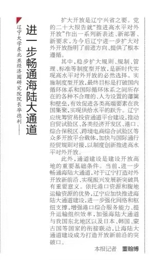 扩大开放是辽宁兴省之要。党的二十大报告就“推进高水平对外开放”作出一系列新表述、新部署、新要求,为今后辽宁进一步扩大对外开放指明了前进方向、提供了根本遵循。其中,稳步扩大规则、规制、管理、标准等制度型开放,是新时代实现高水平对外开放的必然选择。实施制度型开放,最终目标是打破国内循环体系和国际循环体系之间所存在的各种不合理的、人为设置的藩篱和壁垒,有效促进各类高端要素在我国集聚,实现供给水平的跃升。辽宁应统筹贸易投资通道平台建设,推动自贸试验区、各类经济开发区、港口、综合保税区、跨境电商综合试验区等众多开放平台载体,加快与国际通行经贸规则对接,以制度创新推进高水平对外开放。此外,通道建设是建设开放高地的重要基础条件。当前,进一步畅通海陆大通道,对于辽宁打造对外开放新前沿、实现振兴发展新突破具有重要意义。依托港口资源和腹地运输资源的优势,辽宁应加快推进海陆大通道建设,进一步强化网络和枢纽支撑,增强港口综合服务能力、提升运输组织效率,加强海陆大通道与我国东北地区以及日本、韩国、蒙古国等国家的衔接联动,让海陆大通道建设成为打造开放新前沿的突破口。(辽宁日报 记者 董翰博)