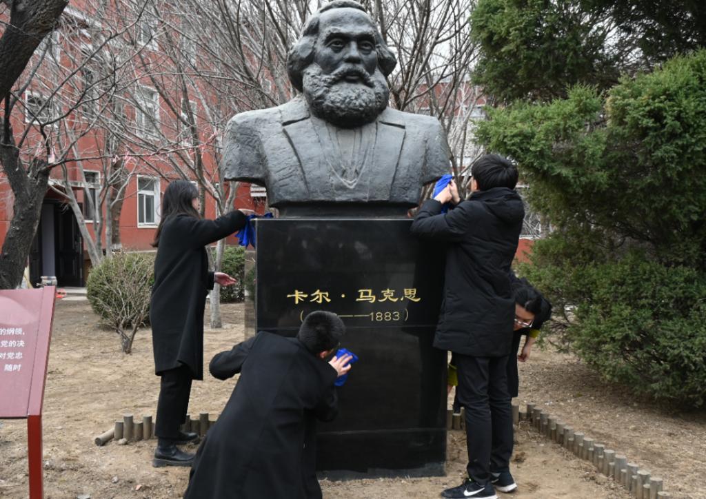 同学们依次向马克思雕像敬献鲜花,寄托对革命导师的深切缅怀和崇高敬意。