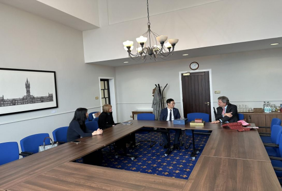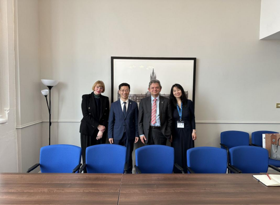 格拉斯哥大学校长安东尼•马斯凯特里(Anton Muscatelli)教授、副校长(负责国际事务)瑞秋•桑迪森(Rachel Sandison)女士、亚当•斯密商学院经济系主任丁赛教授会见余淼杰。