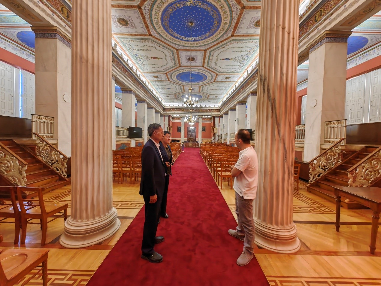 潘一山实地考察了雅典国立卡波蒂斯坦大学哲学院,并与哲学院院长迪米特里奧斯・德罗索斯(Dimitrios Drosos)教授进行深入交流。雅典国立卡波蒂斯坦大学哲学院历史悠久、体系庞大,拥有独立图书馆、24个实验室和5个博物馆为教学和研究提供支持,为欧洲最大的哲学院。双方同意加强沟通深化合作,促进两校之间互鉴互学、共同进步。潘一山一行还走访和考察了学校主校区、法学院图书馆等雅典国立卡波蒂斯坦大学基础设施。