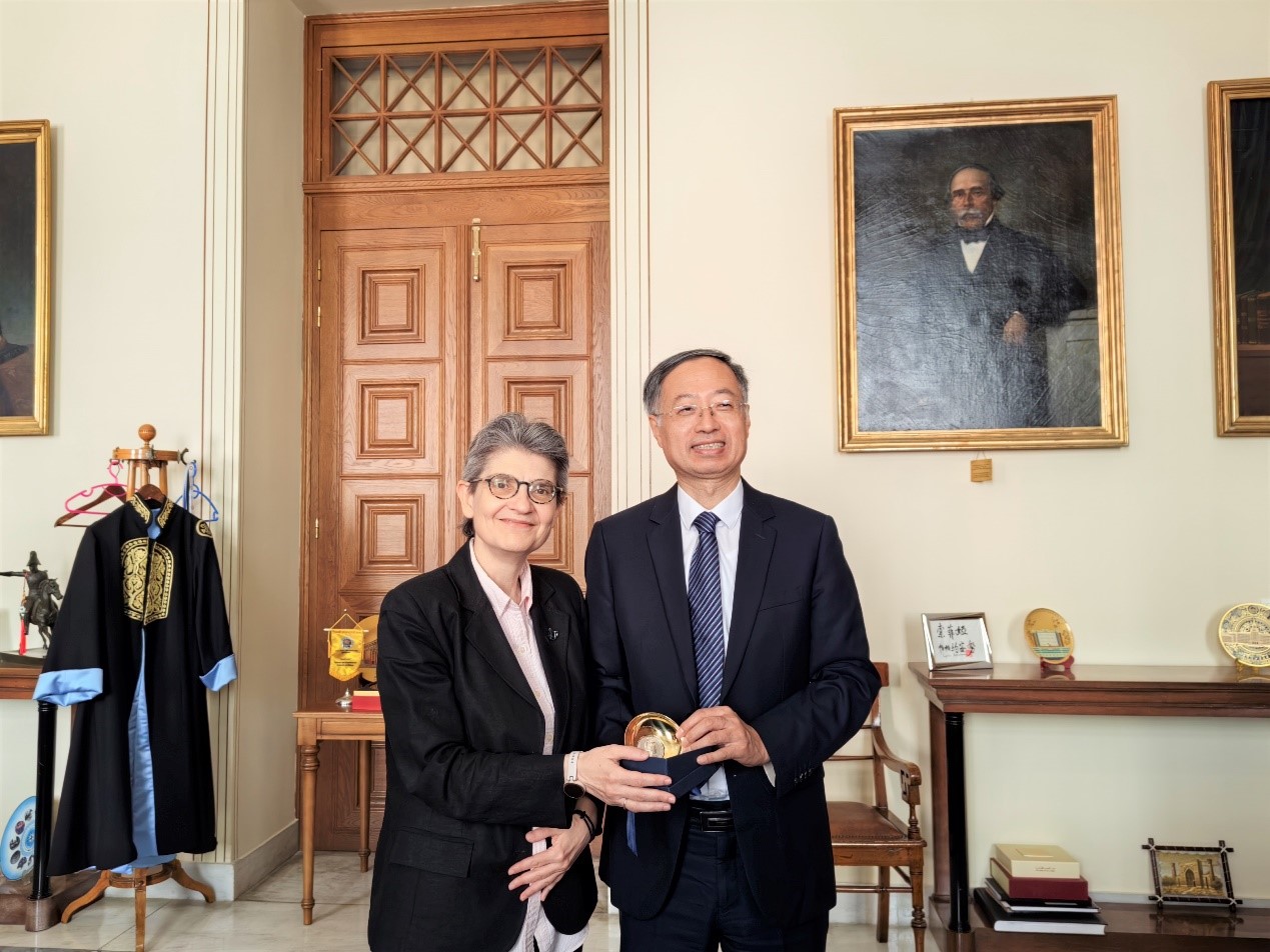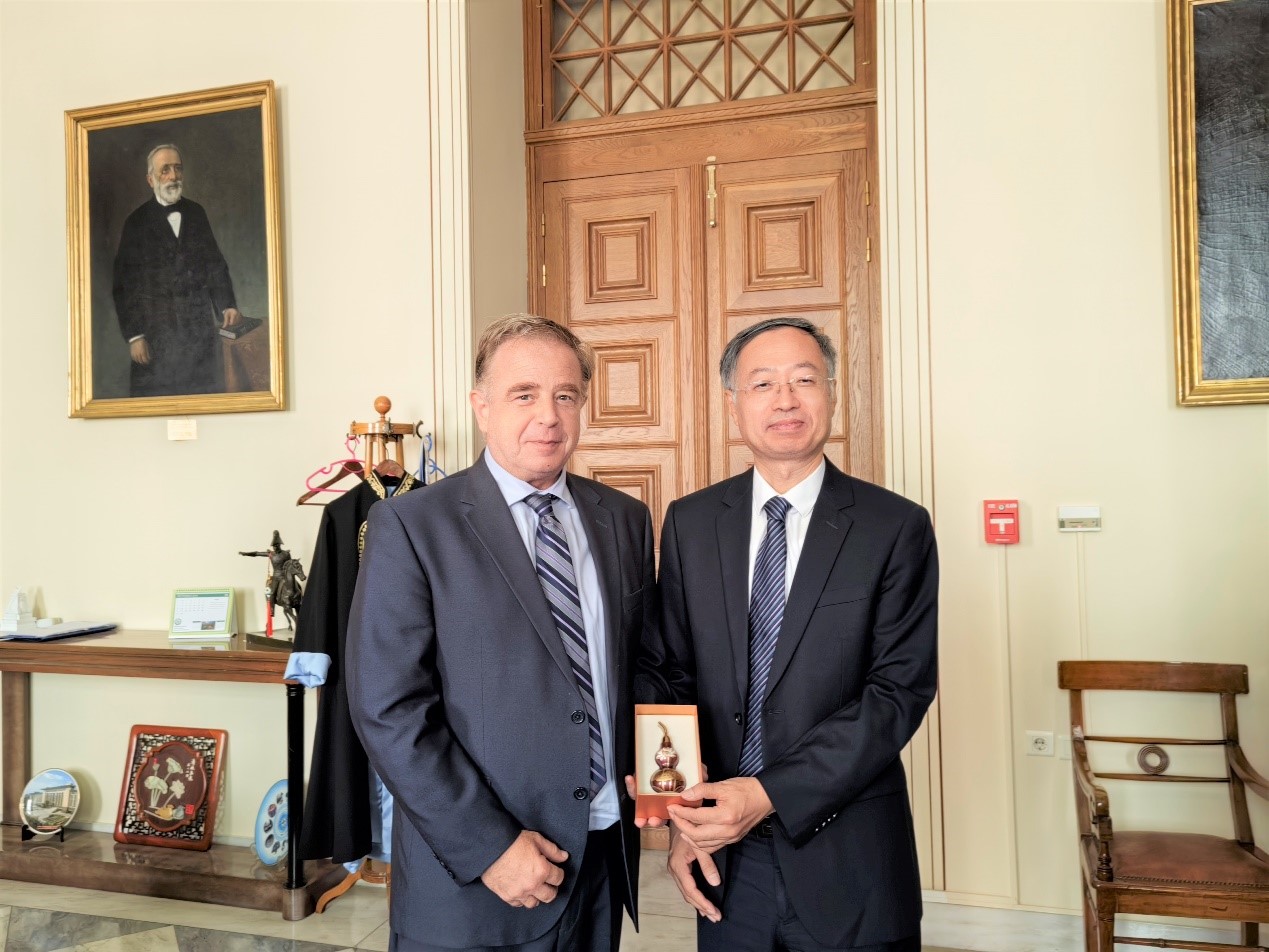 成立于1837年的雅典国立卡波蒂斯坦大学是希腊历史最悠久的大学,也是整个希腊学术界的最高殿堂。潘一山一行受到雅典国立卡波蒂斯坦大学副校长索菲亚・帕派约安努(Sophia Papaioannou)的热情接见。在会谈中,潘一山和索菲亚分别介绍了各自学校的优势学科及发展情况,一致认为两校在人文学科及纯理学科领域开展合作交流的空间较大,特别是在哲学、历史、考古、法律、艺术、数学、物理、化学、药学等方向都有相匹配的学科。
