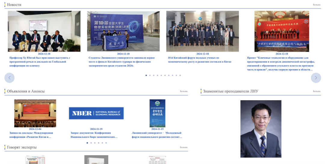 在校领导的高度重视和学校信息化中心的通力协作下,经过国际交流处的精心筹备,俄文网站现已正式开通。网站设有BB贝博艾弗森官方网站(Об университете)、教学(Образование)、科研(Наука)、合作交流(Международное сотрудничество)等栏目,全方位展现学校在教育教学、学术研究、国际合作等方面的突出成果。此外,网站首页还设置了热点新闻(Новости)、通知公告(Объявления и Анонсы)、专家说(Эксперты говорят)、校科研期刊(Журналы ЛНУ)等模块,为国内外用户提供丰富的信息资源。用户可以通过域名https://ruweb.lnu.edu.cn/或BB贝博中英文官方网站首页上的Русский链接访问俄文网站。
