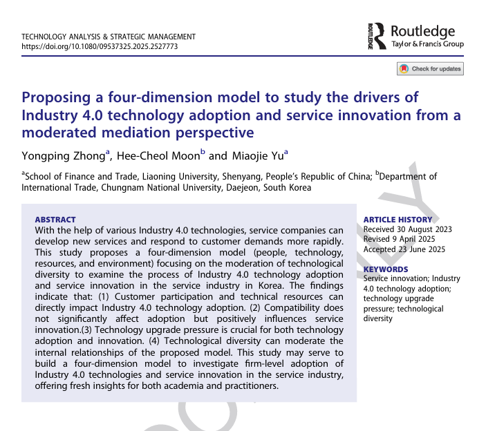 论文摘要:在工业革命4.0技术的支持下,服务企业能够更快地开发新的服务产品并响应客户需求。本研究构建了一个整合“人员-技术-资源-环境”四维要素的理论框架,特别聚焦技术多样性的调节效应,系统考察了韩国服务业企业在工业革命4.0转型背景下技术采纳与服务创新的协同演进机制。研究发现:(1)客户参与和技术资源能直接影响工业革命4.0技术的采纳;(2)技术兼容性对相关技术的采纳无显著影响,但能正向促进服务创新;(3)技术升级压力对相关技术采纳和创新均具有关键作用;(4)技术多样性能够调节企业内外部要素间的路径关系。本研究创新性地构建了一个四维整合模型,为学术界和服务业实践者系统考察企业层面的工业4.0技术采纳机制与服务创新路径提供了全新的理论框架和分析视角。